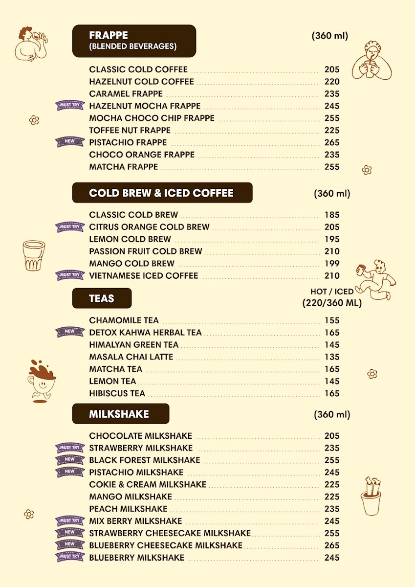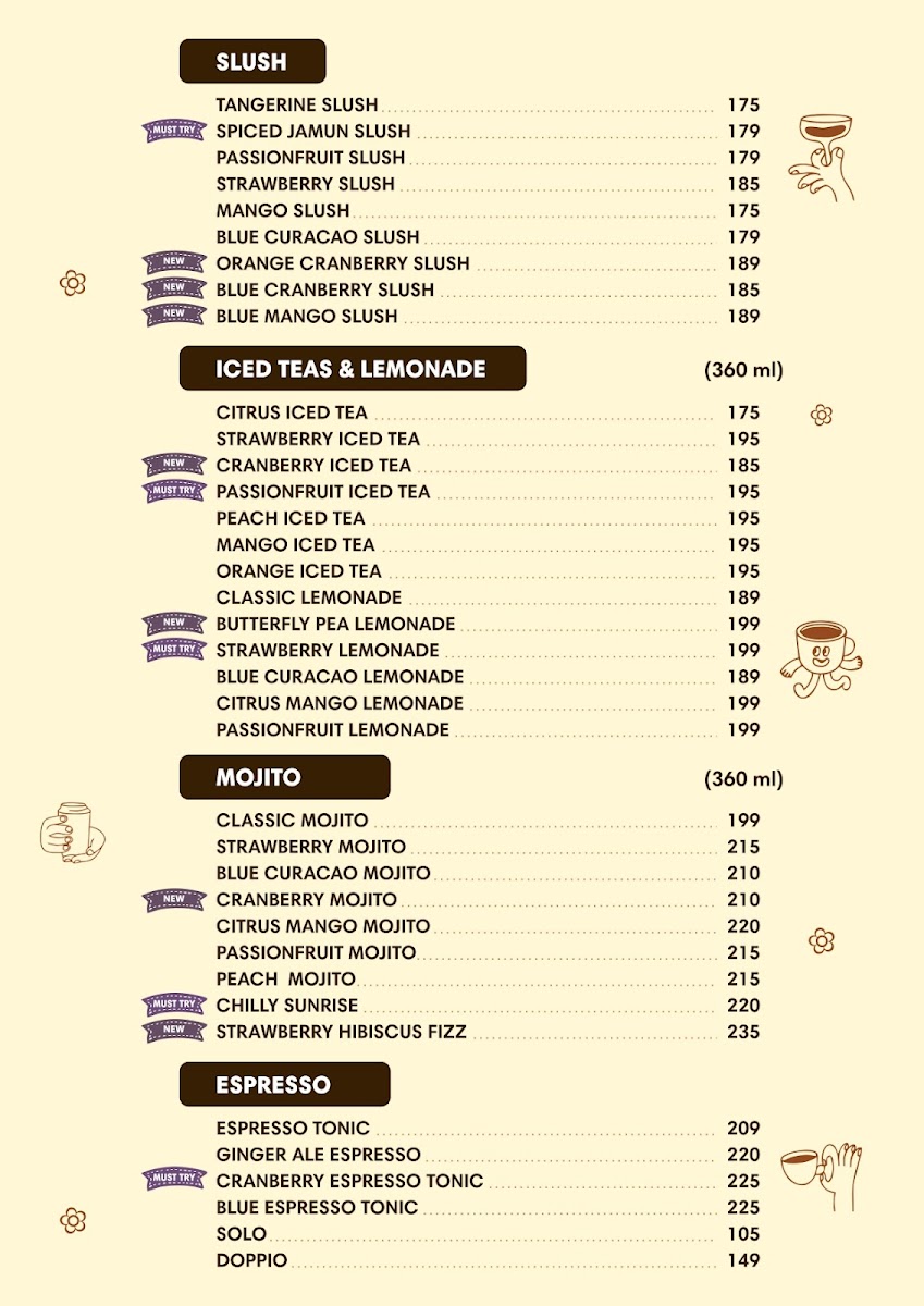The menu offers a variety of options organized into distinct categories to cater to different needs throughout the day. For those seeking savory meals, the Pizza section includes choices such as Margherita, Farm House, and Pesto Pizza. The Quick Bites category features light meal options like Chilli Cheese Toast, Paneer and Cheese Toasties, Fusion Vada Pav, and Korean Bun, suitable for a casual snack or a light lunch.